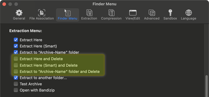 To minimize such risks, Bandizip keeps the Extract and Delete feature disabled by default. To access the feature, go to Preferences > Finder Menu tab and check the checkbox(es) as shown in the screenshot below.